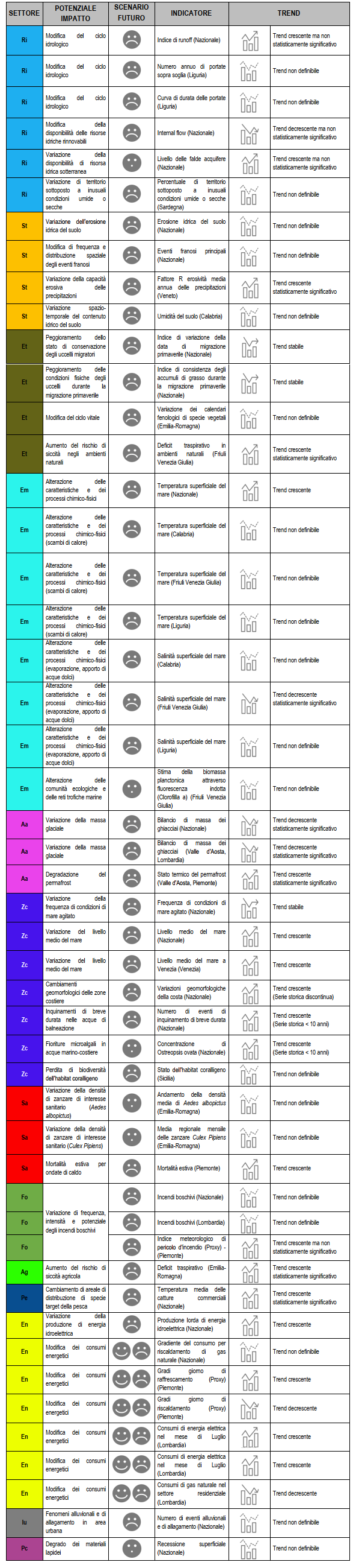 Di seguito il “Quadro sinottico degli indicatori di impatto dei cambiamenti climatici presentati nel Rapporto”.