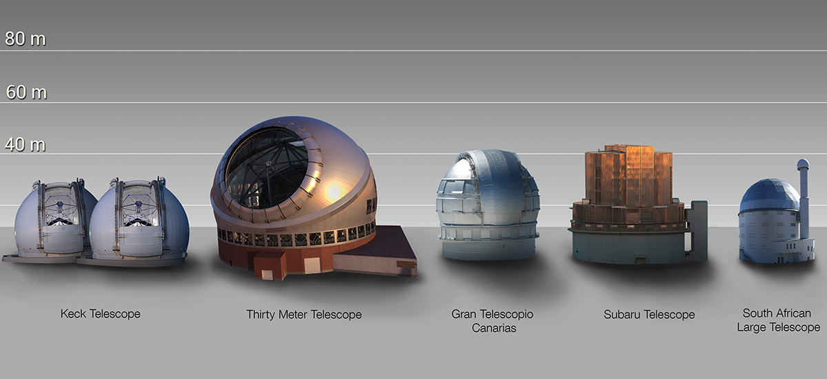 Confronto indicativo, ma estremamente eloquente, tra la struttura che ospiterà il TMT e alcune strutture astronomiche attualmente operative. Nella grafica non sono raffigurate alcune strutture altrettanto imponenti, per esempio l’edificio del Large Binocular Telescope (52 m), le due cupole dei telescopi Gemini (46 m) e le quattro strutture del Very Large Telescope (25 m). Crediti: ESO