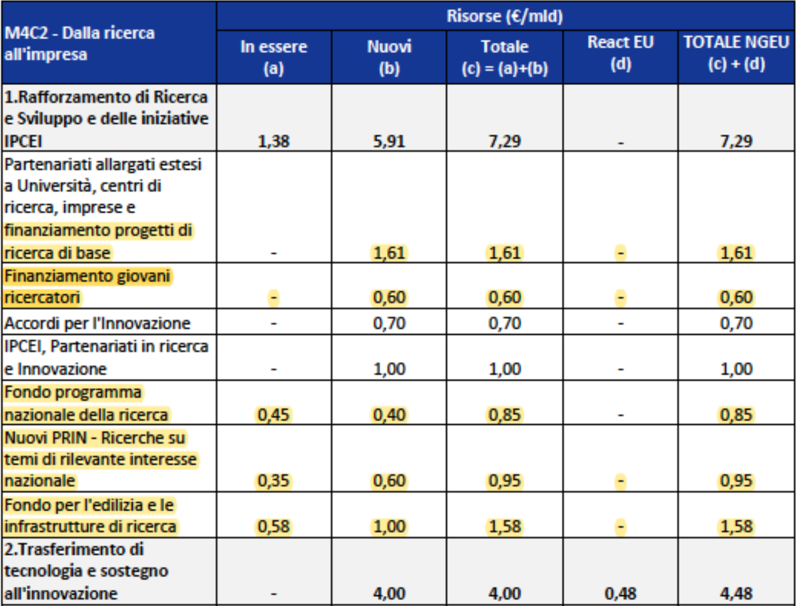 Più precisamente, come si legge nella seconda tabella, 4,48 MRD sono attribuiti direttamente al “trasferimento di tecnologia e sostegno all’innovazione” e dei restanti 7,29 MRD soltanto la metà – come evidenziato in giallo – sono veramente destinati alla ricerca. Questi 3,7 MRD sono ben lontani dai 15 MRD della nostra proposta e non sono in grado di dare un aumento significativo dell’intensità di ricerca e sviluppo, che è attualmente allo 0,5% del PIL. Questo è tanto più vero perché parte di questi investimenti sono limitati nel tempo e non possono rappresentare quell’aumento strutturale e permanente dei fondi dedicati alla ricerca nel bilancio dello Stato che è assolutamente necessario per competere almeno con la Francia.