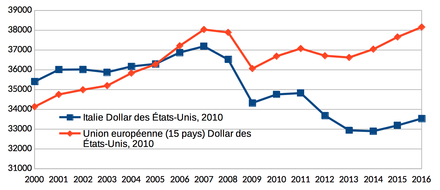 Grafico 5. Andamento del PIL pro capite annuo dell’Italia e dei Paesi dell’UE 15 ($)