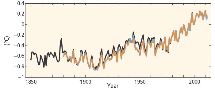 Figura 4. Andamento della temperatura media globale della Terra negli ultimi 150 anni rispetto alla media del periodo 1986-2005. I differenti colori del grafico si riferiscono a diversi set di dati utilizzati per costruire l’andamento (IPCC, 2014)