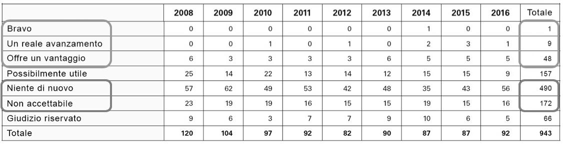Tabella 1. Classificazione dei nuovi farmaci approvati dall’organismo europeo EMA negli ultimi dieci anni (2008-2017). La rivista Prescrire, che ne aveva valutato l'efficacia clinica, riportava che: su 943 farmaci esaminati, solo 58 rappresentavano un reale progresso terapeutico, mentre 662 erano classificati come inutili o non accettabili e i 223 rimanenti avevano un rapporto beneficio-rischio ancora difficilmente valutabile