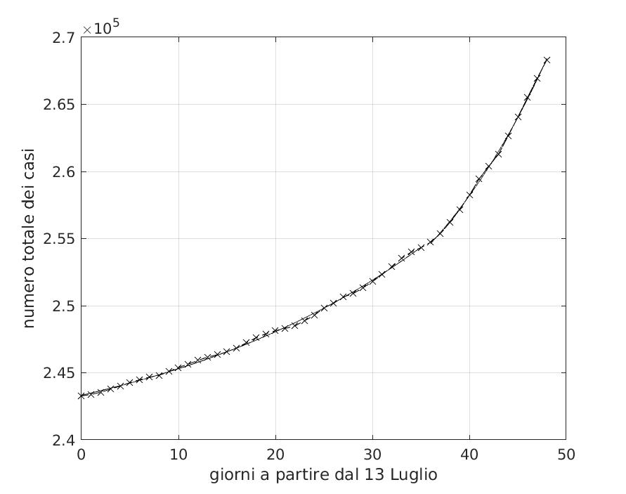 Figura 2 Andamento del numero totale di contagiati da coronavirus in Francia nel periodo dal 13 luglio al 30 agosto 2020. Il miglior fit con un modello esponenziale è sovrapposto ai dati.