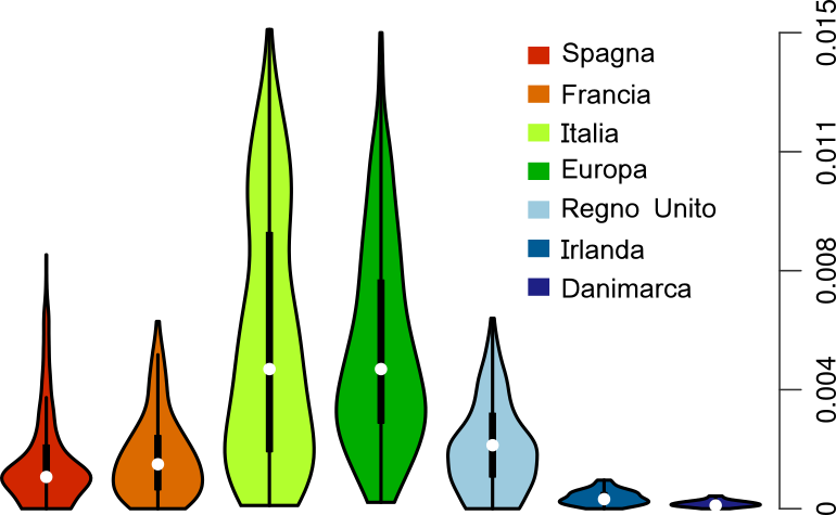 Figura 1 Grafico a violino rappresentante la differenziazione genetica in diverse popolazioni europee. Crediti: Raveane et al./Science Advances. Licenza: CC BY-NC 4.0