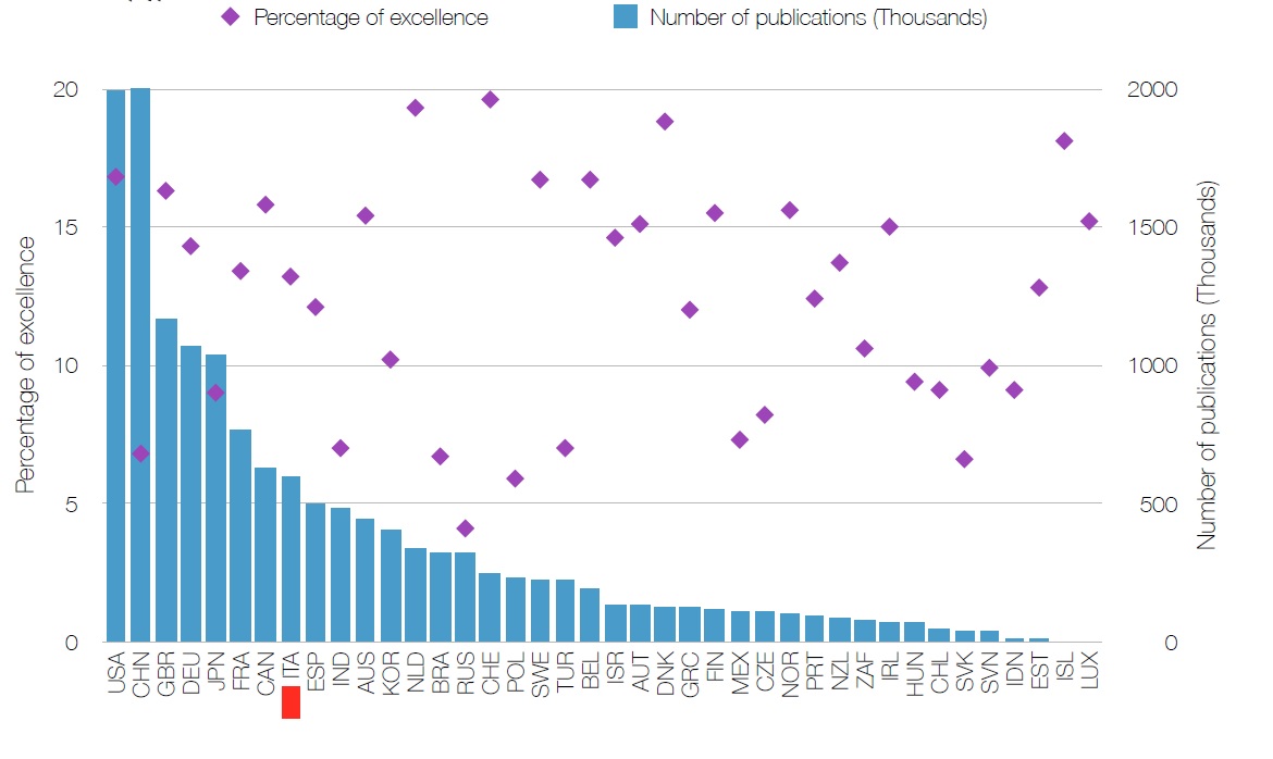 Si può ben dire che l'Italia, povera di investimenti in ricerca e di ricercatori, riesca comunque a tenere una buona posizione quanto a numero di pubblicazioni scientifiche a livello internazionale, piazzandosi ottava. Se dal numero delle ricerche si passa tuttavia ad esaminare le ricerche con più citazioni (top-cited), l'Italia si attesta a un 13% del totale, laddove 18 paesi totalizzano un numero di ricerche top-cited comprese fra 13 e 20%. Segno che, per quanto produttiva a livello scientifico, il sistema della ricerca italiano è relativamente più povero rispetto ad altri di collaborazioni fra diversi istituti (sia a livello nazionale sia a livello internazionale). 2.0134.260