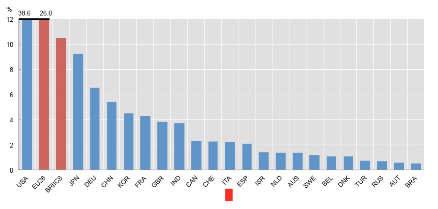Basandoci sul nuovo Rapporto OCSE 2013 - Science, Technology and Industry Scoreboard 2013. OECD Publishing (http://dx.doi.org/10.1787/sti_scoreboard-2013-en - abbiamo cercato di scattare una fotografia dell'Italia in questo campo in relazione agli altri paesi OCSE. Ecco i dati più significativi.