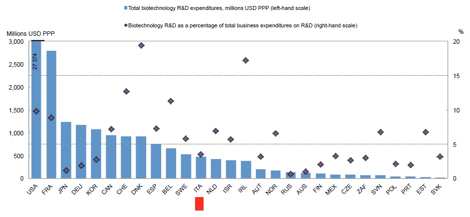 Ma il numero delle aziende non è il parametro migliore per comprendere al meglio l’attività di una nazione nelle biotecnologie. I dati sugli investimenti privati per la ricerca e lo sviluppo (BERS) per le biotecnologie forniscono una misura più diretta degli sforzi nella ricerca. L’Italia dedica alle biotecnologie il 3,6% del totale degli investimenti privati, una percentuale più bassa rispetto a molti paesi, dalla Spagna (7,3%) alla Danimarca (19,4%), all'Irlanda (17,2%).