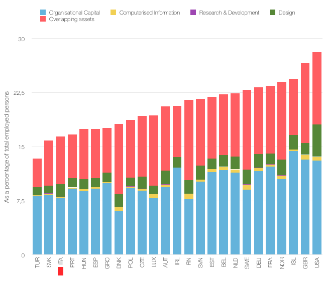 Cruciale è anche il grado di formazione tecnico scientifica dei lavoratori di un paese. A questo proposito l'OCSE ha messo a punto un indicatore sperimentale per misurare il grado di capitale basato sulla conoscenza in relazione alla formazione e ai compiti dei lavoratori impiegati nelle aziende dei diversi paesi, mettendo insieme ricercatori, addetti al design del prodotto, informatici e altre figure qualificate che possono fare la differenza in un'azienda. Fra i paesi OCSE si va da un minimo del 13% (Turchia) a un massimo del 28% (USA) di percentuale di capitale ad alto valore aggiunto di conoscenza sul totale degli occupati. L'Italia si pone parecchio in basso nella scala dei paesi.