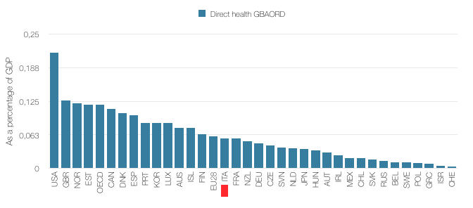 Per quanto riguarda in particolare l'investimento diretto pubblico in ricerca sociosanitaria e biomedica, il governo italiano è sotto sia la media OCSE sia la media dell'Unione europea e non arriva allo 0,1% del PIL .