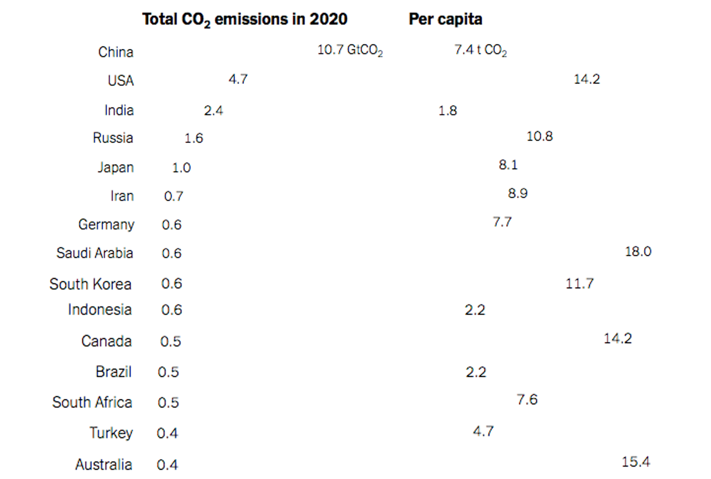 Un altro metro per misurare responsabilità ed equità distribuisce le emissioni pro capite. Per esempio, nel 2020, l'India nel suo insieme ha prodotto circa il 7% delle emissioni mondiali di anidride carbonica (circa come l'Unione Europea e la metà degli Stati Uniti); ma l'India ha una popolazione più numerosa di quelle di USA e UE insieme e molto più povera, con centinaia di milioni di persone prive di un accesso affidabile all'elettricità. Di conseguenza, le emissioni per persona dell'India sono molto più basse che nelle altre due regioni; il ragionamento inverso spiega i valori dell'Australia.