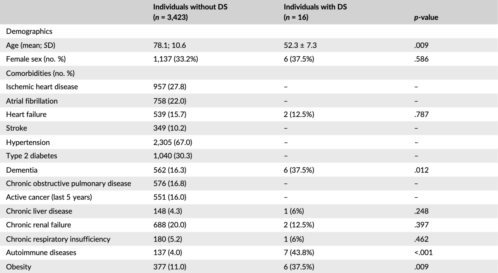 Anche le malattie autoimmuni, come tiroidite di Hashimoto e psoriasi, erano significativamente più diffuse nel gruppo studiato (44% contro 4%), così come la demenza (38% contro 16%). Queste condizioni sono noti fattori di rischio, in quanto associate a uno stato proinfiammatorio che sembra avere un ruolo nell'insorgenza di gravi complicazioni di Covid-19. Infine, diverse anomalie anatomiche delle vie aeree superiori e l’atonia muscolare, assieme all’obesità, aumentano il rischio di ostruzione delle vie aeree, di disfagia e apnea ostruttiva del sonno nelle persone con sindrome di Down, tutti fattori che predispongono a una ipertensione polmonare, a sua volta un fattore di rischio che fa presagire un'infezione più grave.