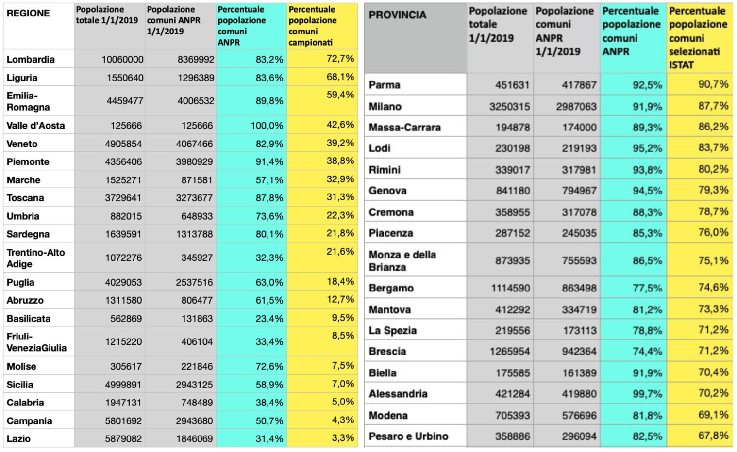 Tabella 1. Copertura dati Istat per regione | Tabella 2. Copertura dati Istat per provincia.
