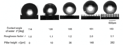 In queste condizioni la goccia tornerà ad essere una sfera quasi perfetta. E, di più, come una biglia di vetro comincerà a rotolare non appena la superficie di appoggio verrà inclinata anche di pochissimi gradi. La ragione è intuitivamente semplice: quando la superficie di contatto tra goccia e solido si riduce alle sole cime delle asperità, allora le forze di adesione che mantengono la goccia attaccata diventano molto piccole.