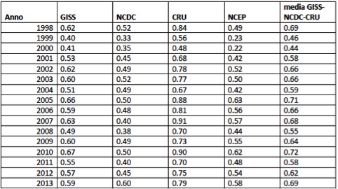 Tabella 1 – Anomalie di temperatura rispetto a un periodo di riferimento. Per GISS il periodo di riferimento è il 1951-1980, mentre per tutti gli altri è il 1961-1990 (tra i due periodi vi è una differenza di 0,09°C).