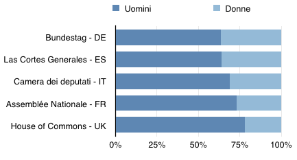Le statistiche sono state elaborate sulla base delle informazioni disponibili e consultabili su dati.camera.it; dati.senato.it; assemblee-nationale.fr; congreso.es; bundestag.de; parliament.uk; ipu.org (Inter Parliament Union)