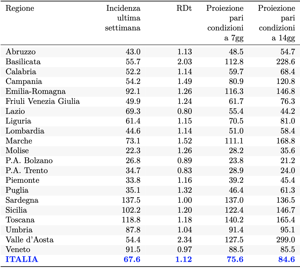 L’incidenza settimanale è calcolata come rapporto tra la somma dei casi positivi notificati in settimana e il totale dei residenti della Regione, riportando poi il rapporto a 100.000. L’indice di replicazione diagnostica (RDt 7;7) è il rapporto tra la media dei casi notificati negli ultimi sette giorni e la media dei casi notificati nei precedenti sette giorni. Le proiezioni “a pari condizione” sono i valori che si avrebbero se l’incidenza attuale si sviluppasse in modo moltiplicativo la stessa intensità manifestata nell’ultima settimana.