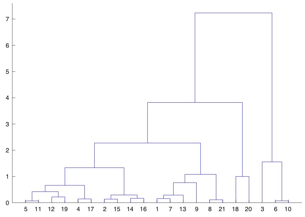 Questo può essere fatto per esempio con l'algoritmo del clustering gerarchico che minimizza localmente la somma delle varianze all'interno dei gruppi delle grandezze considerate. Nella figura seguente è illustrato tramite il "dendrogramma" il risultato ottenuto. Osserviamo l'evidenza di cinque gruppi: