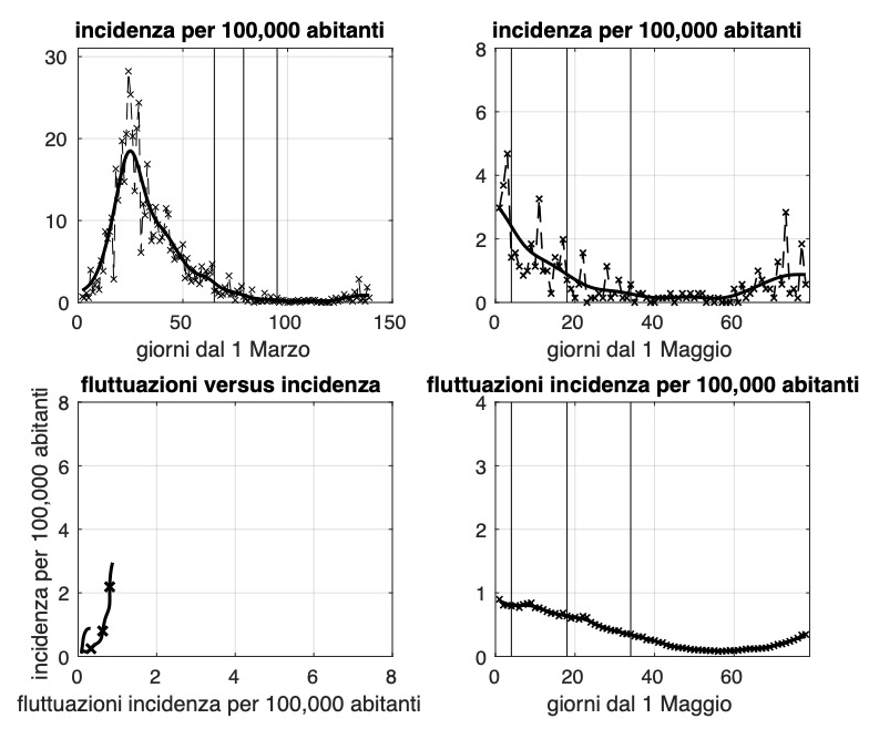 Si noti che dopo circa 7-10 giorni dal primo rilascio di lockdown del 4 maggio, in Liguria e Piemonte è diminuita la velocità con cui va a zero l’incidenza. Dopo circa 7-10 giorni dal secondo rilascio di lockdown del 18 maggio, c'è stata un'analoga diminuzione di velocità anche per la Lombardia. Dopo circa 7-10 giorni dal 3 giugno, inizio dei flussi tra regioni, notiamo un'ulteriore diminuzione della velocità con cui va a zero l'incidenza media per tutte e tre le regioni sopra citate, se non un lieve aumento finale per la Lombardia.