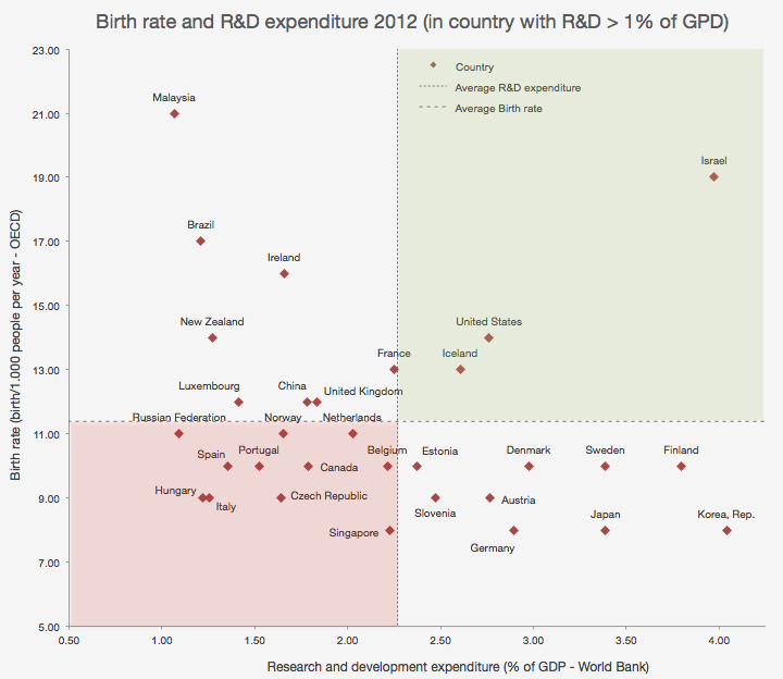 Nemmeno togliendo i paesi che destinano a R&S meno dell'un per cento del PIL (nel grafico qui sotto) emerge una correlazione tra natalità e spesa. Nel quadrante verde i paesi con natalità e spesa in R&S sopra la media (da segnalare l'outlier Israele), nel quadrante rosso i paesi con natalità e spesa R&S sotto la media: l'Italia è qui perché, come noto, occupa le ultime posizione per entrambi questi indicatori. Nel quandrante in basso a destra invece i paesi con una felice decrescita demografica che non intacca la possibilità di pensare al futuro e spendere in R&S grandi quote del proprio PIL.