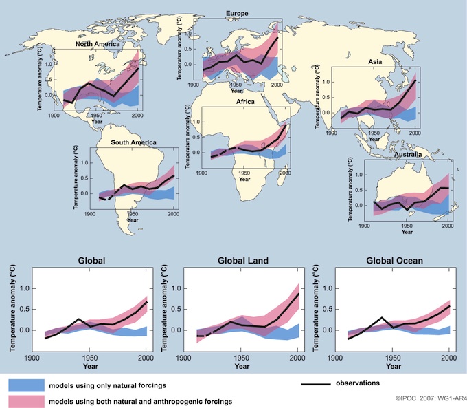 Utilizzando i dati del secolo scorso, il grafico confronta la temperatura globale attesa secondo un modello (azzurro) che prevede il contributo di sole cause naturali con la temperatura attesa da un modello (rosa) che prevede il contributo di cause sia naturali sia antropiche: la linea nera traccia il dato delle temperature effettivamente rilevate e coincide con le temperature attese dal modello naturale/antropico.