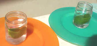 Il modo più semplice per vedere l'ossigeno prodotto dalle foglie è di fare come in queste foto. Le foglie, sia quella esposta al sole, sia quella tenuta al buio, sono immerse in acqua di rubinetto. L'esperienza è durata appena mezz'ora... e i risultati si vedono!