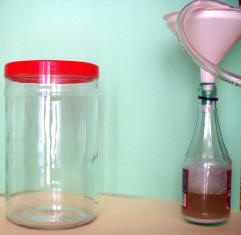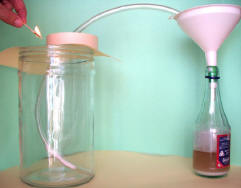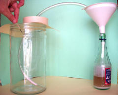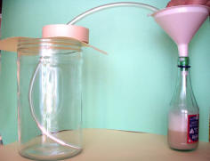 L’aceto va versato poco per volta, senza agitare. Quindi si preme il tubo nel collo dell’imbuto e si agita gradualmente, in modo da controllare la schiuma ed evitare che vada a finire nel tubo. Il gas attraverserà l’ovatta ed entrerà nel barattolo, stratificandosi dal basso e scacciando l’aria dalla sommità. |