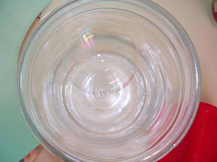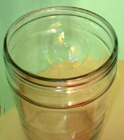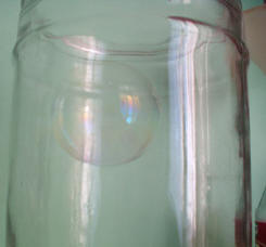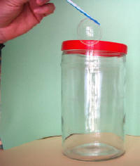 Aprire il barattolo svitando il coperchio e facendolo poi scorrere orizzontalmente e lentamente, per evitare rimescolamenti eccessivi con l’aria soprastante. Il metodo migliore è di soffiare le bolle con la cannuccia immersa nel barattolo. Quando saranno abbastanza grandi saliranno da sole ancor prima di staccarsi dalla cannuccia. Se si staccano bolle troppo piccole queste cadranno sul fondo. Se il barattolo è ben pieno di gas la bolla galleggerà in cima alla sua superficie. Appena scende un po’ al disotto dell’orlo si può chiuderla nel barattolo. La bolla è intrappolata! |