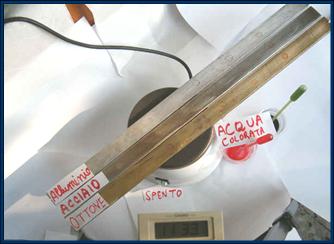 Si pongono 4 gocce uguali di acqua colorata a distanze regolari e una quinta all’estremità delle barrette. Si accende il fornellino, che in pochi minuti supera la temperatura di 200 °C. Le gocce bolliranno quando la temperatura supererà i 100 gradi a causa della trasmissione del calore. Può essere opportuno mettere le gocce più distanti solo dopo che le vicine siano evaporate. Questi i risultati dell’esperimento di Luciano. Accensione 12:09; 12:12 bolle Al 1ª; 12:13 Ot 1ª; 12:14 Al 2ª ; 12:16 1ª Ac, 12:17 2ª Ot; 12:17 3ªAl; 12:20 4ª Al; 12:28 4° Al; 12:30 5ª Al; 12:30 inizia 2ª Ac e 4ª Ot, si altera la scritta dell’alluminio. (Al = alluminio, Ot = acciaio, Ac = acciaio) |