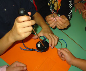 A coppie i bambini costruiscono un circuito con la carta stagnola, e lo fanno poi provare ad un’altra coppia di compagni. Inseriscono anche “falsi collegamenti” , in modo che dai fori si intraveda la carta stagnola ma che in reltà non vi sia poi collegamento con altre lettere.
