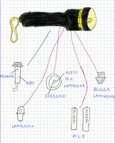 Si tratta di un sistema composto da tanti piccoli pezzi, che abbiamo fotografato e disegnato sul quaderno. All’interno dell’interruttore, sotto il pulsante grande abbiamo trovato un interruttore più piccolo: schiacciando il pulsante grande il movimento si trasmette al pulsante piccolo.