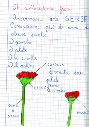 I bambini disegnano il fiore sul quaderno, e scrivono i nomi delle componenti principali.