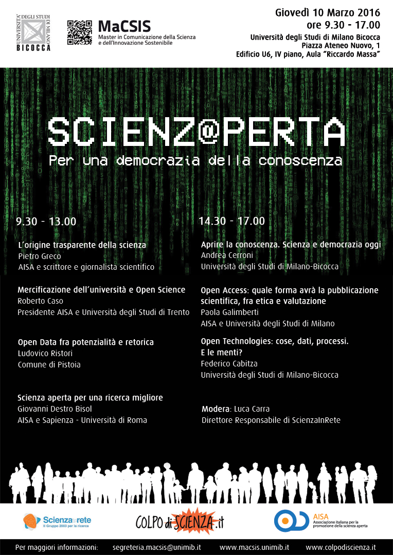 La giornata, organizzata dagli studenti del Master MaCSIS in collaborazione con AISA, Associazione Italiana per la Promozione della Scienza Aperta, e ScienzaInRete, web journal del Gruppo2003 per la ricerca, avrà come protagonisti docenti, giornalisti ed esperti che si confronteranno sui principali temi dell’Open Science (Open Access, Open Data, Open Technologies ecc.).
