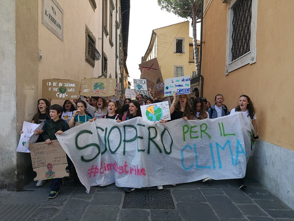 Nell'immagine: bambini e ragazzi scioperano a Pisa per chiedere ai governi azioni concrete contro il cambiamento climatico. Credit: Alessandra Parravicini.