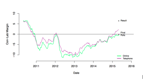 Subito dopo le elezioni del 2010, i sondaggi sia online sia telefonici hanno mostrato un sostegno leggermente superiore per i Conservatori, con un margine di circa l'1%. Questa tendenza si è invertita all'inizio del 2011 e, da allora fino al 2014 i sondaggi tendevano a dare un testa a testa tra il partito di Cameron e quello di Ed Miliband. Come è andata a finire? Un trionfo dei Tory con oltre cinque punti distacco