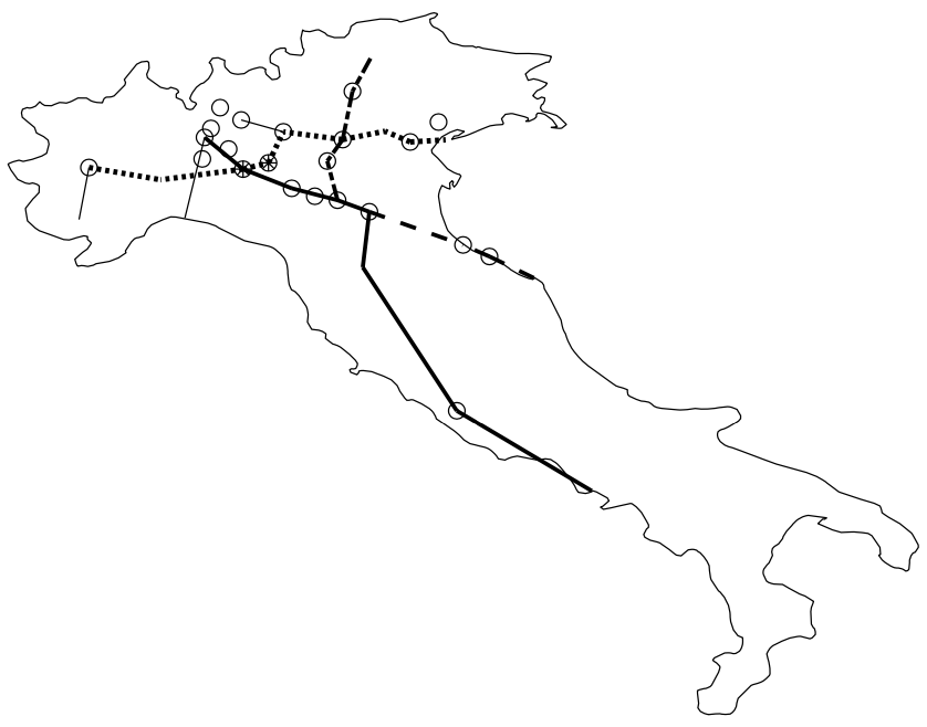 Figura 2. Distribuzione spaziale delle 33 province italiane che al 5 aprile hanno più di 1.000 contagiati osservati. Le province di Piacenza e Cremona sono rappresentate dai due cerchietti più scuri. Sono inoltre rappresentati i tratti di quattro autostrade di carattere internazionale che attraversano i capoluoghi della stragrande maggioranza di queste province.