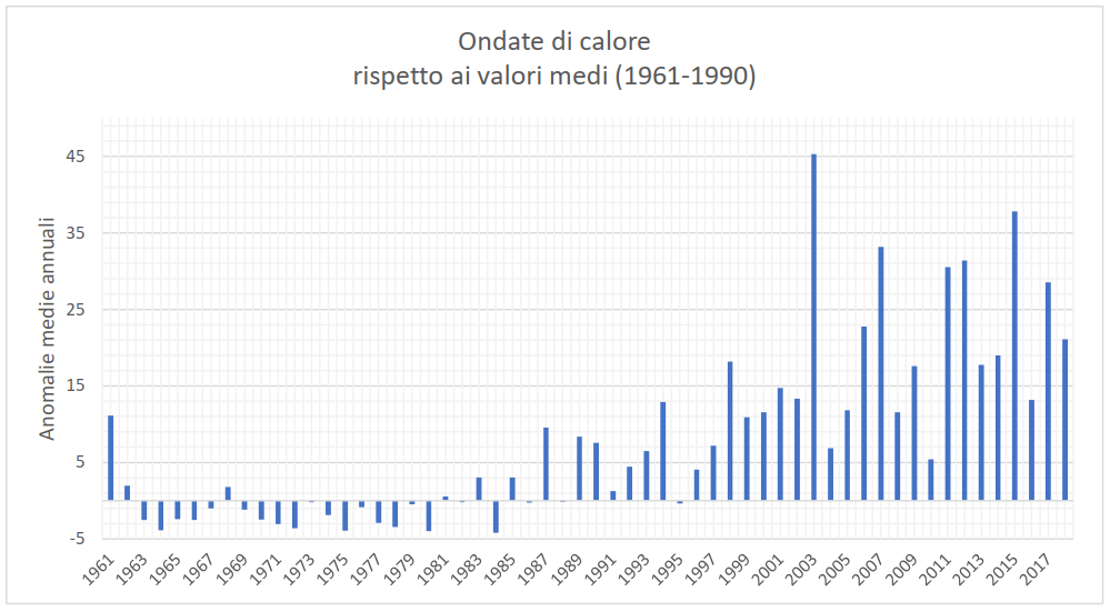 Nel rapporto “Gli indicatori del CLIMA in Italia nel 2019”, ISPRA riporta che su “scala globale il 2019 è stato il secondo anno più caldo della serie storica dopo il 2016. In Italia, con un’anomalia media di +1.56°C rispetto al valore climatologico di riferimento 1961-1990, il 2019 è stato il terzo anno più caldo dal 1961, dopo il 2018 e il 2015. Ad eccezione di gennaio e maggio, tutti i mesi dell’anno sono stati nettamente più caldi della norma, con punte di anomalia positiva nel mese di giugno: +4.25°C al Nord, +4.0°C al Centro, +3.27°C al Sud e Isole.”