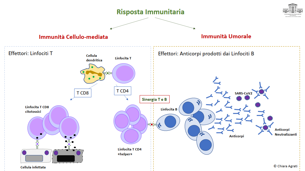 Figura 2 – La risposta immunitaria umana è un meccanismo estremamente complesso, nel quale agisce un tipo di risposta più immediata (immunità umorale), azionata dagli anticorpi neutralizzanti prodotti dai Linfociti B, ed una immunità cellulo-mediata, garantita dai linfociti T i quali svolgono la duplice funzione di sopprimere le cellule infette e di conservare la “memoria” delle infezioni passate.
