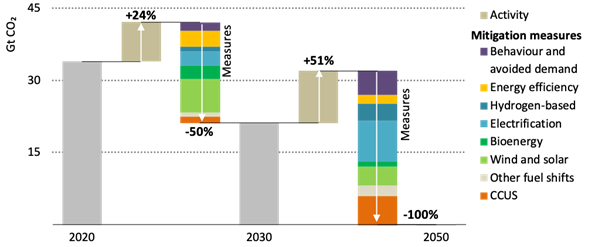 L’abbandono delle fonti fossili in favore di energia elettrica prodotta a basse emissioni è uno degli elementi più importanti del percorso net-zero 2050, contando per circa il 20% della riduzione delle emissioni nel 2050. La domanda di elettricità dovrebbe più che raddoppiare nei prossimi 30 anni, in particolare per via dell’industria che la impiegherà per processi a basse e medie temperature e la produzione secondaria di acciaio.
