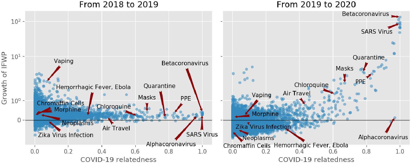 Crescita percentuale tra il 2018 e il 2019 (a sinistra) e tra il 2019 e il 2020 (a destra) del numero di pubblicazioni pesate per impact factor in funzione dell'affinità delle parole chiave con la ricerca su Covid-19 (ogni punto rappresenta un gruppo di pubblicazione con una particolare parola chiave, MeSH). Immagine da M. Riccaboni, L. Verginer, "The impact of the COVID-19 pandemic on scientific research in the life sciences", PLOS ONE, 17, 1-16, 2022.