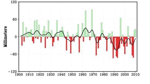 Fig.2 - Immagine del trend di precipitazioni invernali del NOAA – trend di precipitazioni invernali nell'area del Mediterraneo nel periodo 1902-2010.