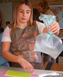 A questo punto alcuni bambini hanno chiesto: “Come facciamo a farli interagire se prima dobbiamo chiudere il sacchetto?” Il tutor ha risposto che potevano usare gli stessi bicchieri e il sacchetto per tenere separati l’aceto dal bicarbonato finché non l’avranno chiuso bene. Alcuni hanno messo il bicarbonato nel sacchetto, altri hanno versato l’aceto nel sacchetto ehanno lasciato il bicarbonato nel bicchiere, altri ancora hanno messo entrambi i bicchieri in piedi nel sacchetto. Quindi hanno sigillato il sacchetto togliendo più aria possibile e poi hanno mescolato i materiali provocando l’interazione nei loro sistemi chiusi. Fortunatamente nessun sacchetto è scoppiato, anche se due di essi si sono gonfiati tanto da da aprirsi lungo una saldatura e far uscire un po’ di aceto.