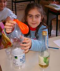 Una volta riempiti i sistemi di gas, i bambini hanno provato a vedere come interagivano con il BTB. Per farlo, un po’ di bicarbonato è stato messo in una bottiglia vuota, e mezzo bicchiere di aceto è stato versato nel palloncino sgonfio. Il palloncino è stato posizionato sul collo della bottiglia e, solo quando il sistema era chiuso, l'aceto è stato versato nella bottiglia.